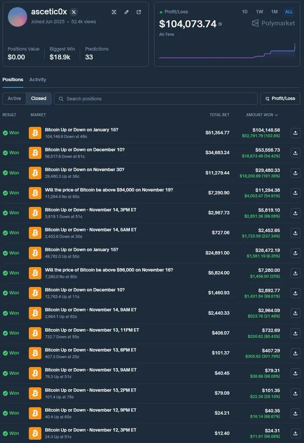 The trader reportedly focused on short- to mid-term Bitcoin price direction markets, selecting outcomes with favorable probabilities rather than extreme odds. By prioritizing accuracy over payout size, ascetic0x avoided major drawdowns and maintained steady growth.