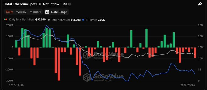 “The 10 spot ETH ETFs saw $92.54 million in net outflows on Thursday, March 26, primarily led by BlackRock’s ETHA with $140.24 million in outflows.”